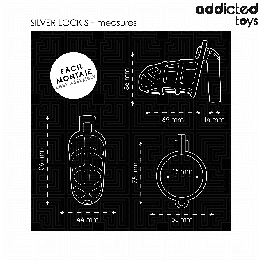 The Addicted Toys Locked Silver Lock Metal Penis Cage S is expertly crafted from strong, high-quality metal to provide long-lasting security and comfort. The snug, secure fit makes it ideal for effective and prolonged restraint, while the polished silver look delivers a touch of luxury to your adventures. With a solid pubic ring for stability and a lock with 2 keys for trustworthy control, you can let your fantasies roam freely. The included components ensure that both beginners and experienced users discover the pleasure of chastity play, discovering all-new dimensions of erotic fun with every detail. Carefully considered dimensions guarantee comfortable, enduring wear and a stimulating experience.