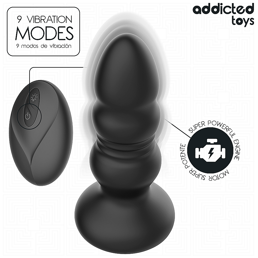 Addicted Toys Thrusting Vibrating Anal Plug by Addicted Toys excites with two independent motors that power sensual thrusts and resonant buzz. 9 thrusting modes range from gentle pulses to assertive waves. 9 vibration modes layer in depth and can be combined freely for custom textures. The wireless remote control lets you switch patterns with a tap or hand the reins to your partner. A color-changing LED base sets a sultry, modern mood. Premium silicone feels velvety and body-safe, while the wide base keeps play secure and comfortable. Its water-resistant build broadens where and how you play and makes cleanup simple. Compact 11.9 × 3.7 cm sizing and a 126 g body aid smooth insertion and steady wear. About 70 minutes of charging provides up to 70 minutes of pleasure.