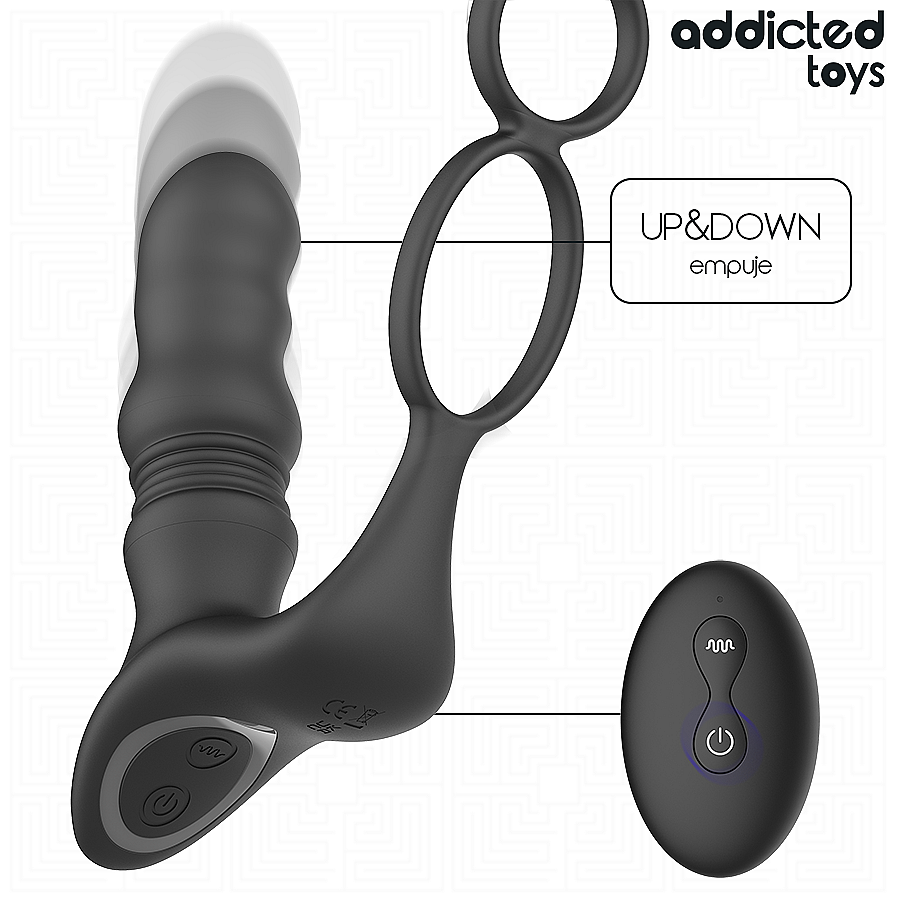 Up and Down Prostatic Ring by Addicted Toys fuses three powerful motors with thrusting motion and rumbly vibrations for intensely focused prostate stimulation. Its ergonomic curved shape naturally follows your anatomy to hit the right spot with comfort and precision. Explore 9 thrusting functions, from gentle rhythmic pulses to deeper, stronger strokes, and fine-tune each moment with 9 vibration modes. A wide, stable base keeps play safe, while the integrated double ring offers a secure grip and improved control. Operation is intuitive—use the on-device buttons or the wireless remote for discreet control. Quiet performance protects your privacy so you can stay in the moment. Premium silicone feels silky, is body-safe, and cleans easily, delivering a smooth glide even during longer sessions. Magnetic USB charging is convenient; after 120 minutes of charging, enjoy up to 70 minutes of powerful play. Its sleek, discreet design makes it a refined companion anytime.