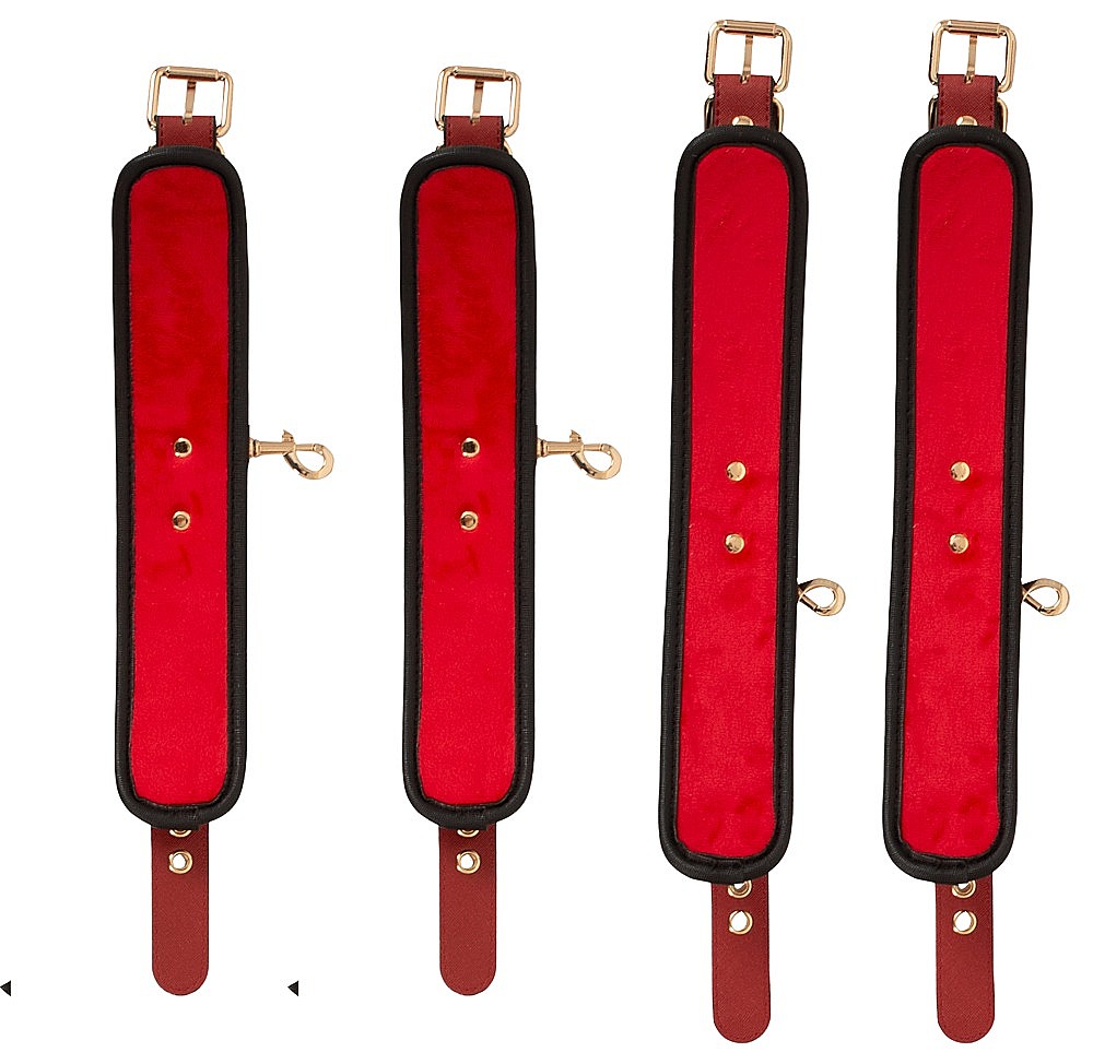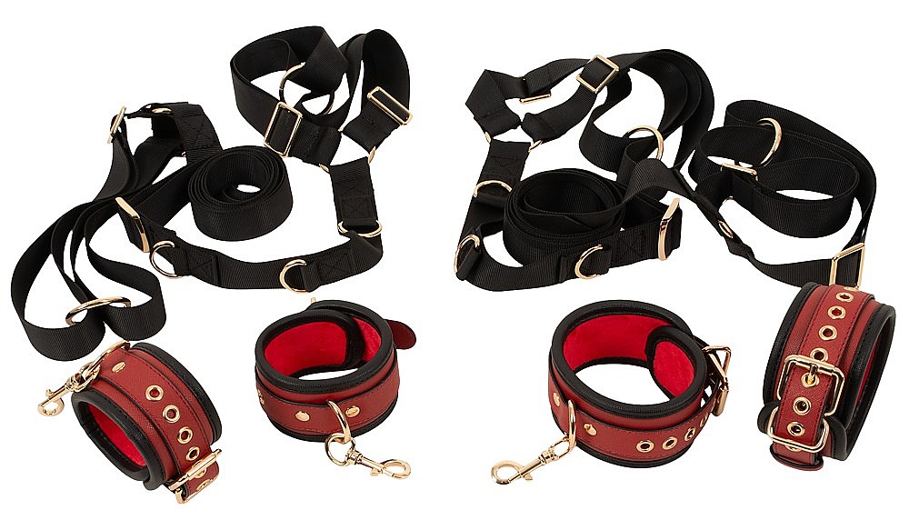 Bad Kitty Bed and Door Restraint Set by Bad Kitty is an elegant 5-piece bondage set in a seductive red and black design, created to transform both a bed and a door into a stylish arena for erotic play. The gold-coloured details and finest imitation leather add a luxurious look while remaining pleasantly comfortable against the skin. The adjustable X-shaped strap can be attached easily to the corners of a mattress or to a door, allowing arms and legs to be spread wide apart whether lying down or standing up. The soft wrist and ankle restraints are quick to put on and easy to adjust with buckle fasteners, making every moment feel secure, practical and intensely playful. Snap hooks connect the restraints to the rings on the straps with ease, so setup is smooth and the experience stays focused on teasing tension and thrilling anticipation. This set is an excellent choice for couples who want to blend visual elegance, comfort and dominant-submissive dynamics in one versatile accessory. Its travel-friendly design also makes it ideal for taking your fantasies beyond the bedroom and into any private getaway.