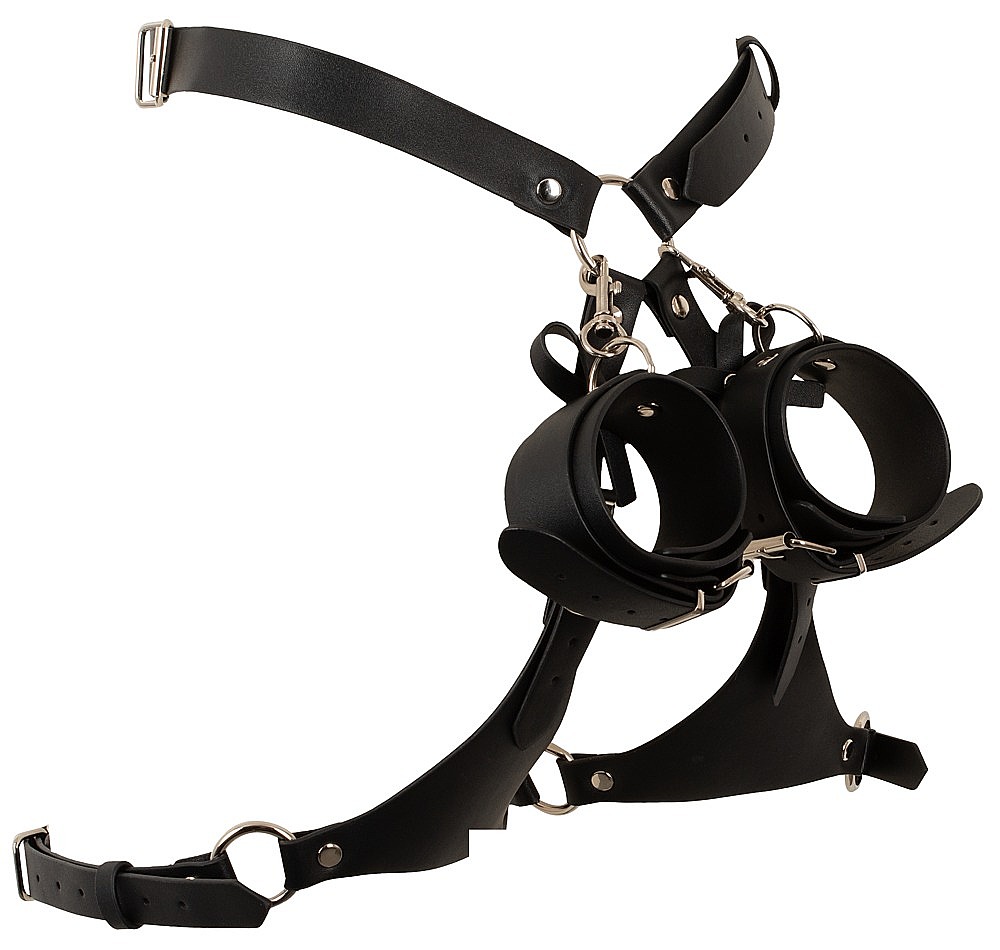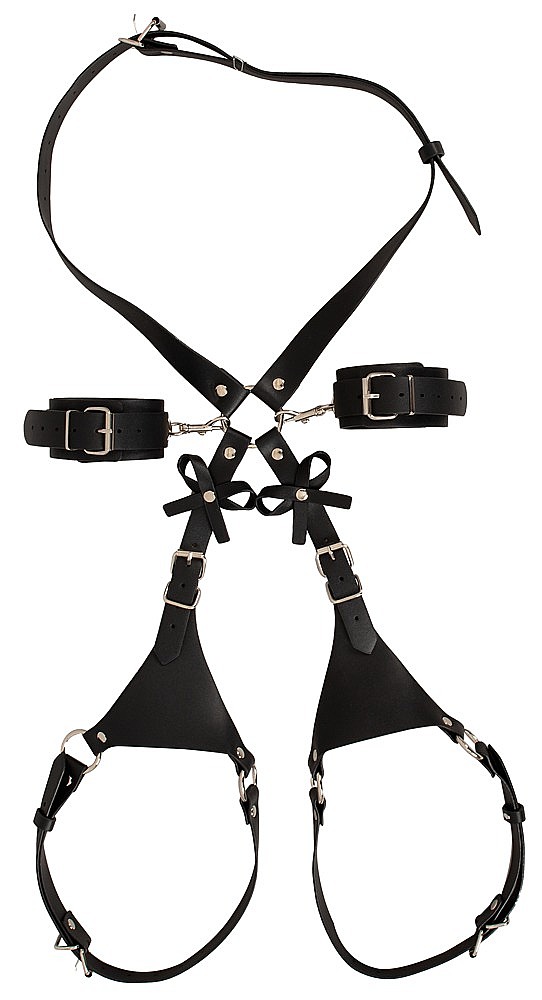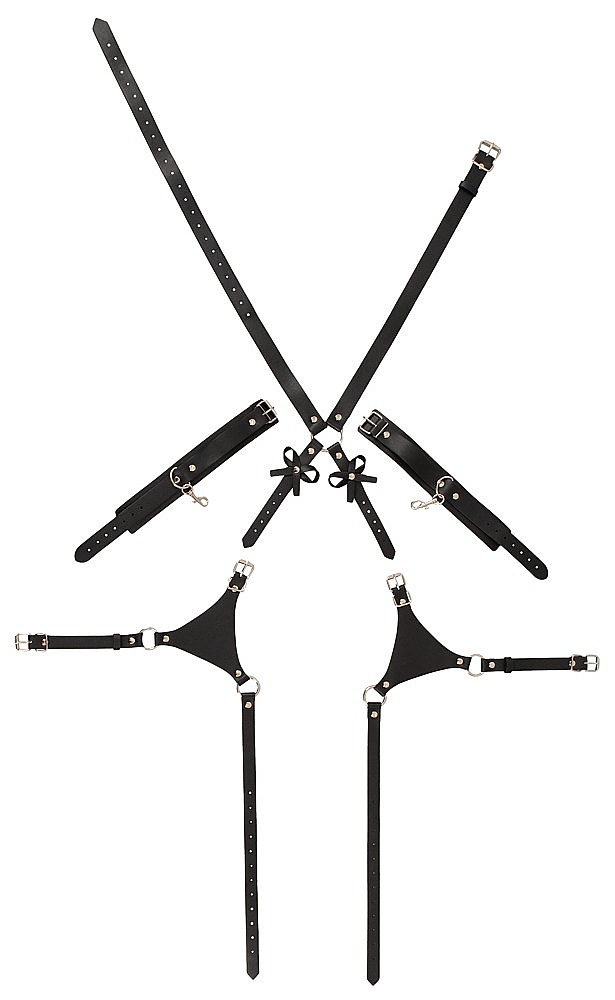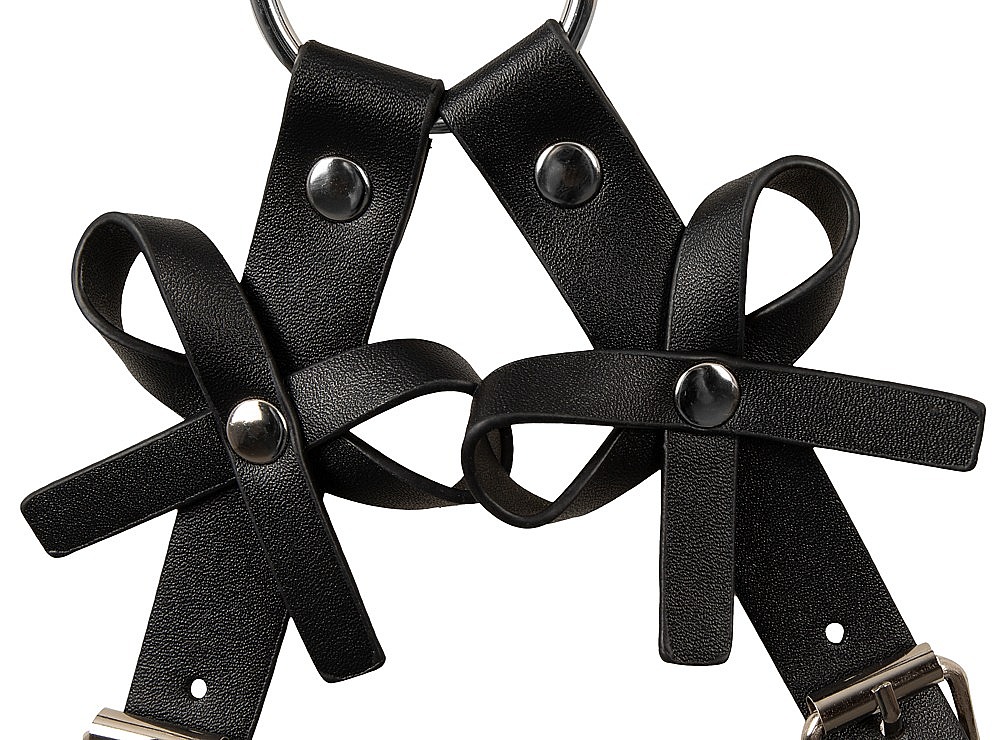 Bad Kitty Body Harness with Cuffs by Bad Kitty is an extravagant body harness set designed to combine seductive style with playful restraint. The elegant black imitation leather is richly decorated with silver-coloured studs and rings, creating a bold and provocative look. The hip harness with thigh straps is adjustable in multiple places with buckle fasteners, allowing it to sit securely and flatter the figure beautifully. Two suspender straps with playful bows can be worn at the front or the back, so the styling can match the mood of the moment. The two soft handcuffs feature adjustable buckles for a comfortable yet secure fit, and their snap hooks make it easy to attach them quickly to the harness. Altogether, this piece offers visual allure, erotic tension and practical functionality in one seductive accessory.