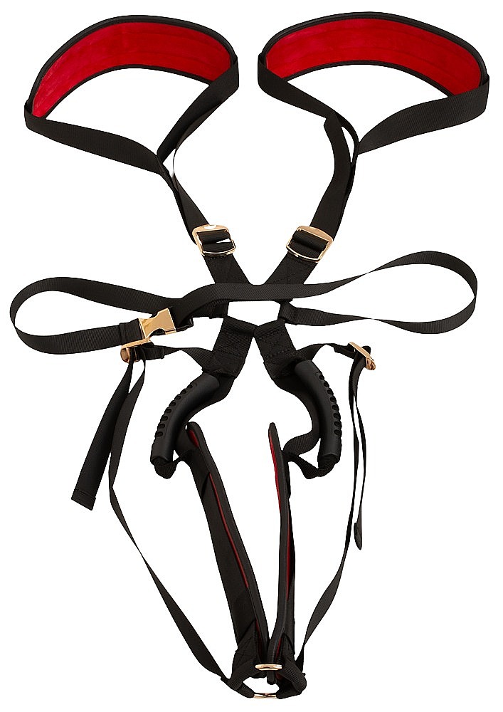 Bad Kitty Body Swing by Bad Kitty is a luxurious support harness designed for passionate erotic play where comfort, control, and seductive style matter. The combination of black straps, red padding made from fine imitation leather, and gold-coloured details creates a bold and enticing look. Its lightweight yet sturdy construction allows quick fitting and easy adjustment with movable sliders for a secure, tailored feel. The comfortable shoulder and leg padding helps both partners enjoy longer sessions with less strain and more pleasure. Sturdy handles at chest height provide a firm, reliable grip even during more intense action. This harness offers optimal support and a secure but comfortable hold, making adventurous positions easier both at home and on the go. With a maximum load capacity of up to 120 kg, it delivers confidence for couples who want to explore with more stability and freedom.