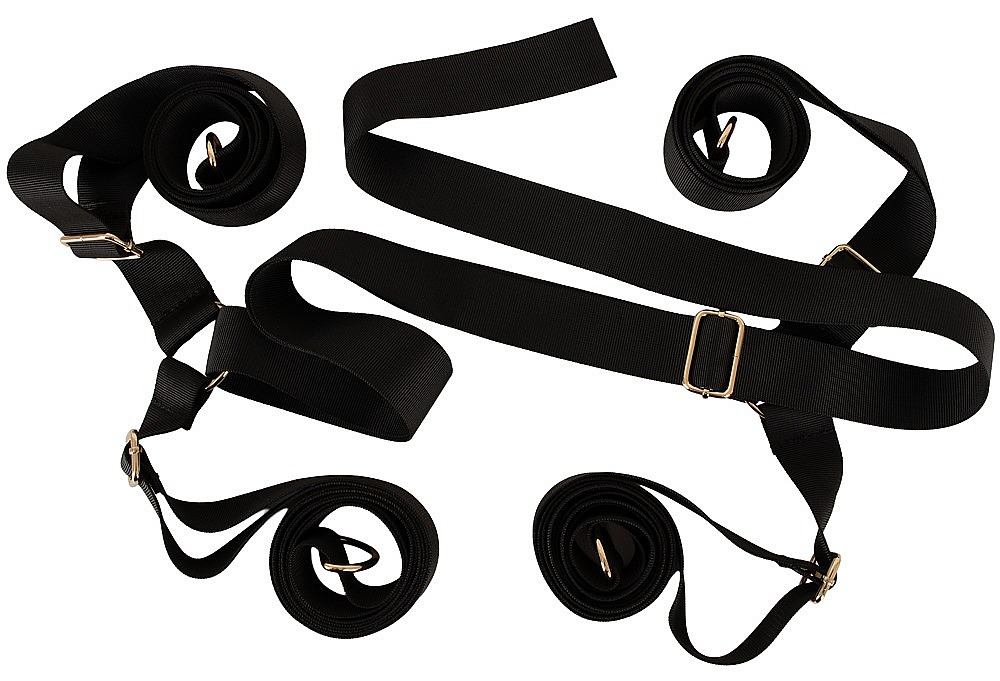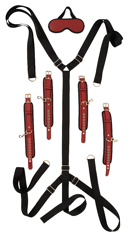 - Package contents: 1 X-shaped strap, 2 wrist cuffs, 2 ankle cuffs, 1 blindfold