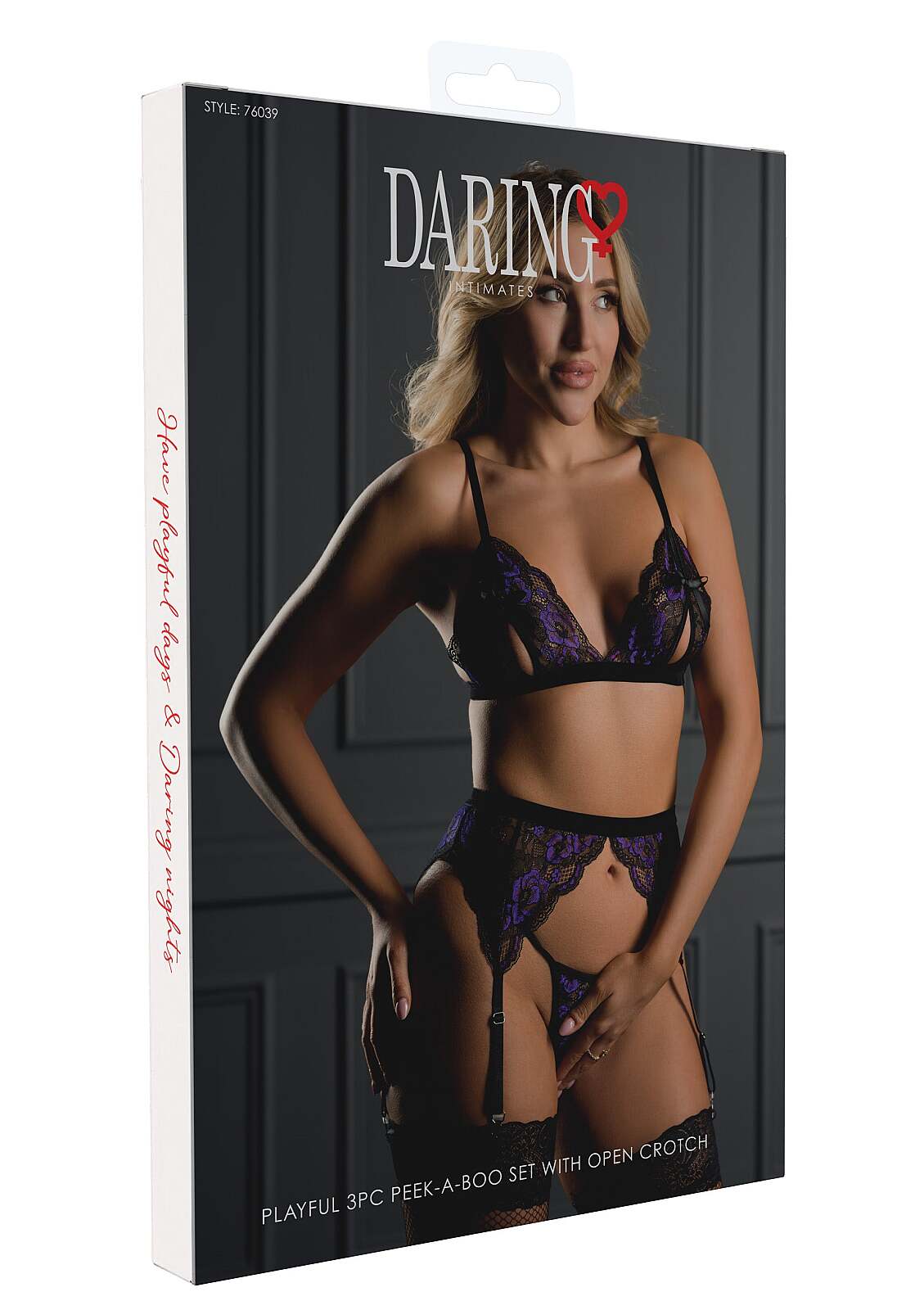Daring Intimates 3PC Peek-A-Boo Bow Set Open Crotch (Purple) by Daring Intimates oozes seduction—soft purple lace caresses the skin while a velvet band hugs your curves just right. Open cups invite wandering eyes and hands, and the open-crotch thong whispers a daring promise. Adjustable garter belts keep stockings perfectly in place, and adjustable straps tailor the fit to your desires. The stretchy fit moves with you for comfort that never kills the mood, and the super soft lace feels deliciously delicate against the body. Lightweight yet impactful, the 3-piece set—open-cup bra, open-crotch thong, and garter belt—lets you mix, match, and mesmerize. The purple hue adds a bold, flirty flair, while every open detail teases with every step.