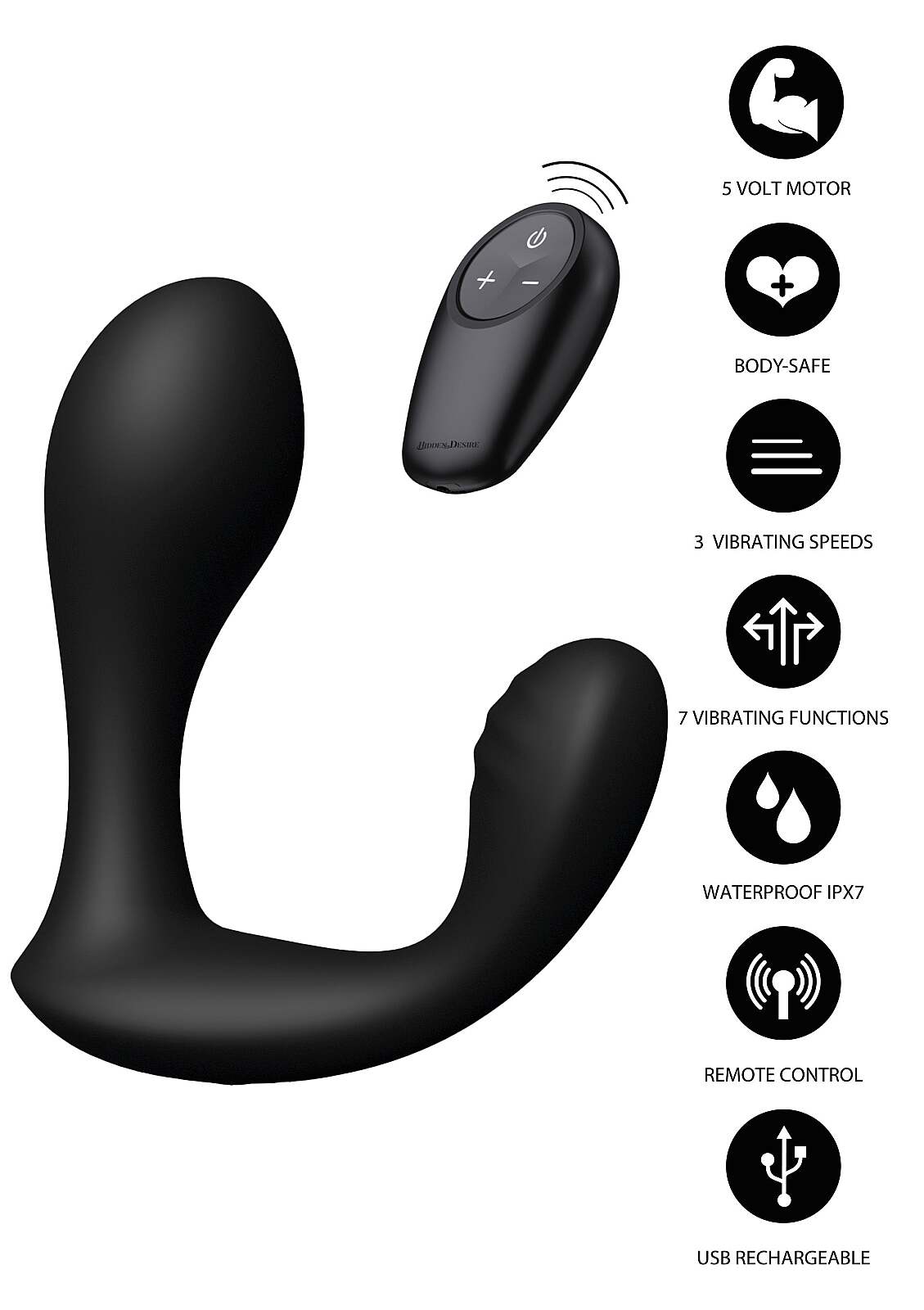 Hidden Desire Bullseye Prostate Plug targets the prostate and perineum with daring, sensual precision. Its expert contoured shape guides every motion straight to deep, heavy rumbles that tease and satisfy. Body-safe silicone glides smoothly while 3 speeds and 7 thrilling patterns (10 in total) build your desire from a purr to a roar. The wireless remote adds hands-free fun for solo adventures or partner play, letting you switch patterns and intensity on command. IPX7 waterproofing invites steamy shower sessions, and USB-C charging keeps the plug ready whenever you are. With a confident 220 g weight, ergonomic comfort, a total length of 12.5 cm and 10 cm insertable, Hidden Desire Bullseye Prostate Plug delivers pinpoint pleasure where you crave it most.