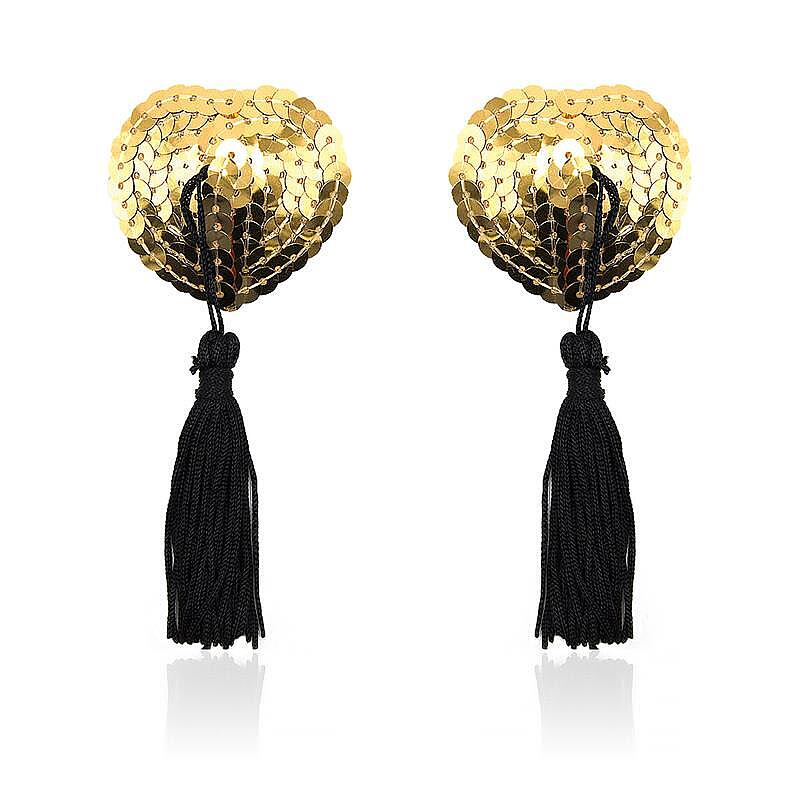 LATETOBED BDSM LINE Heart Nipple Cover with Gold Sequins by LATETOBED is an erotic accessory created for lovers of intense and darker pleasures. These self-adhesive heart-shaped nipple covers are coated with shimmering gold sequins that catch the light beautifully and add a luxurious, flirtatious touch to any outfit. The long black tassel brings extra movement and visual temptation, enhancing every gesture with a sensual, eye-catching effect. Their adhesive design makes them easy to apply, while their daring style makes them perfect for completing a sexy look, elevating intimate play, or surprising a partner with confident, BDSM-inspired charm.