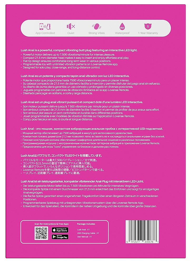 Lovense Lush Anal Vibrator (Pink) blends app-smart control with luscious, powerful sensations. Enjoy unlimited, fully customizable modes tailored in the app for solo or partner play. Long-distance and close-range control turns any gap into intimacy. With up to 7,500 vibrations per minute, it floods your anal sweet spot with deep, satisfying waves. The whisper-quiet 33 dB motor keeps things discreet anywhere. Music sync lets every beat throb through you, while sound-activated mode reacts to moans and commands in real time. The signature 7‑color light-up tail mirrors vibration intensity for a dazzling show. 25+ cam site integration brings reliable, responsive interactivity performers love. IPX7 waterproof tempts you into shower or bath, and the up to 237 min runtime with about 45 min charging keeps the fun flowing. Silky silicone and ergonomic design ensure comfortable insertion and wear. With Lovense Lush Anal, gentle teasing grows into a breathtaking finish.
