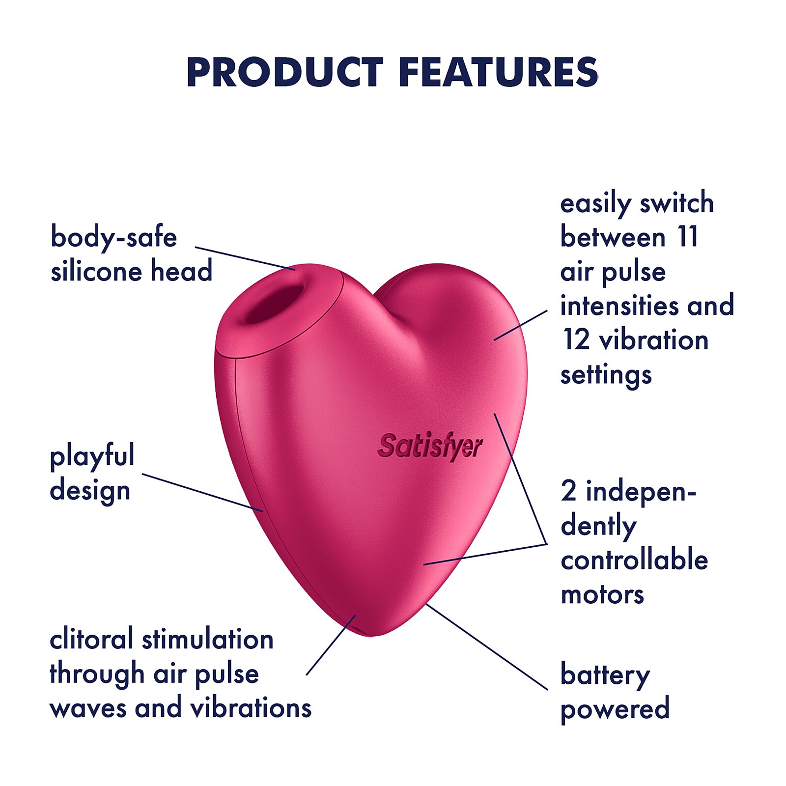 The Cutie Heart Battery Series (Pink) by Satisfyer pairs air-pulse pressure waves with deep vibrations for toe-curling clitoral pleasure. Two independently controlled motors let you blend 11 air-pulse intensities with 12 vibration programs for endless combinations. Its compact heart-shaped design nestles perfectly in your hand and travels discreetly. Ultra-soft, body-safe medical-grade silicone feels silky and stays hygienic. With IPX6 waterproofing, it’s ready for splashy showers or steamy baths, while whisper mode keeps moments discreet. Battery-powered by 2× AAA (not included), it’s always ready—just pop in fresh batteries and play, no charging time needed.