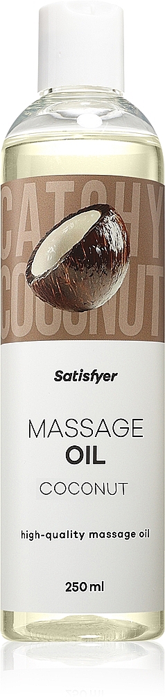 Satisfyer Massage Oil 250 ml (Coconut) surrounds you with a warm, exotic coconut aroma that teases the senses and invites lingering intimate massages. Its nourishing blend of quality oils gives your hands effortless glide while leaving the skin silky-soft and irresistibly smooth. Satisfyer Massage Oil 250 ml (Coconut) sets a relaxed holiday mood—perfect for playful moments together or soothing solo rituals. A small amount is all it takes for an instant effect; reapply anytime for even longer pleasure. The neutral, gentle formula is wonderfully versatile and lets your imagination run free. Satisfyer Massage Oil 250 ml (Coconut) combines sunflower, soybean, and jojoba oils with vitamin E (Tocopherol) for pampered, cared-for skin. The generous 250 ml volume invites endless caresses that delight body and senses.