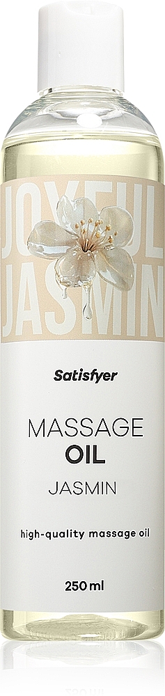 Satisfyer Massage Oil 250 ml (Jasmin) by Satisfyer is a premium massage oil that blooms with a delicate jasmine bouquet, soothing, balancing, and arousing the senses as you glide. Its nourishing plant oils pamper the skin and leave it velvety-smooth, so every touch flows effortlessly and seductively. Celebrated as a symbol of sensuality, jasmine unveils its aphrodisiac charm here—deepening intimacy and setting a romantic mood. The gentle, versatile formula frees your imagination, whether you’re embracing a full-body ritual or teasing only the sweetest spots. A small amount in your palms or directly on the skin is all it takes—the caring effect unfolds instantly, and you can reapply whenever you desire more glide and more pleasure. Sunflower, soybean, and jojoba oils cocoon the skin with comfort, elasticity, and a soft glow, while jasmine weaves an irresistible aura around the moment. The smooth slip supports long, flowing strokes and lets your hands dance with confident ease. Neutral in feel and beautifully adaptable, it’s ideal for playful foreplay as well as deep relaxation after a long day.