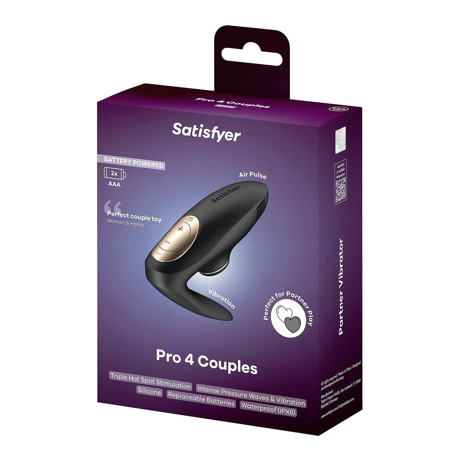 Satisfyer Pro 4 Couples Battery Series (Black) by Satisfyer blends non-contact Air Pulse clitoral waves with a vibrating internal arm for G-spot delight—double stimulation that will excite you. The slim silicone shaft slips in comfortably and teases the G-spot with 12 vibration programs. The external head pampers the clitoris with 11 Air Pulse intensities that flutter, pulse, and build to explosive release. Two motors are independently controllable, letting you dial in your perfect mix of waves and vibrations. Whisper mode keeps things discreet without sacrificing power. With IPX6 waterproofing, it invites you into the shower for wet-and-wild fun. Body-safe silicone feels silky on skin and cleans up with ease afterward. Powered by 2 AAA batteries (not included), it’s always ready—no charging delays, perfect for travel and spontaneous play.