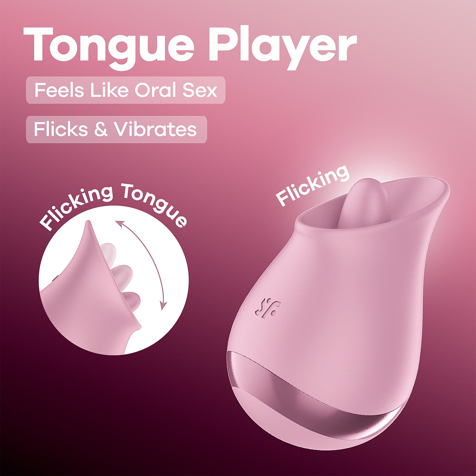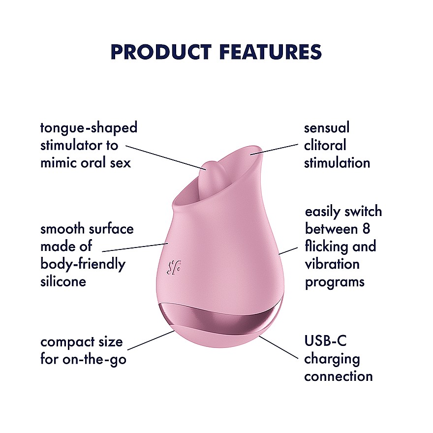 Satisfyer Tongue Player (Mauve) features a flicking silicone tongue that imitates realistic oral stimulation and tickles the clitoris with precision. 8 licking modes range from soft teasing to bold, rhythmic flicks. 8 vibration programs add deep, rumbly thrills for tailor-made pleasure. The super-soft, body-safe silicone feels velvety and amplifies every pulse. An ergonomic shape sits perfectly in hand for effortless control. The whisper-quiet motor keeps your moments discreet, while IPX7 waterproofing invites shower play and makes cleaning easy. With USB‑C recharge and a lithium-ion battery, it’s always ready when you are.