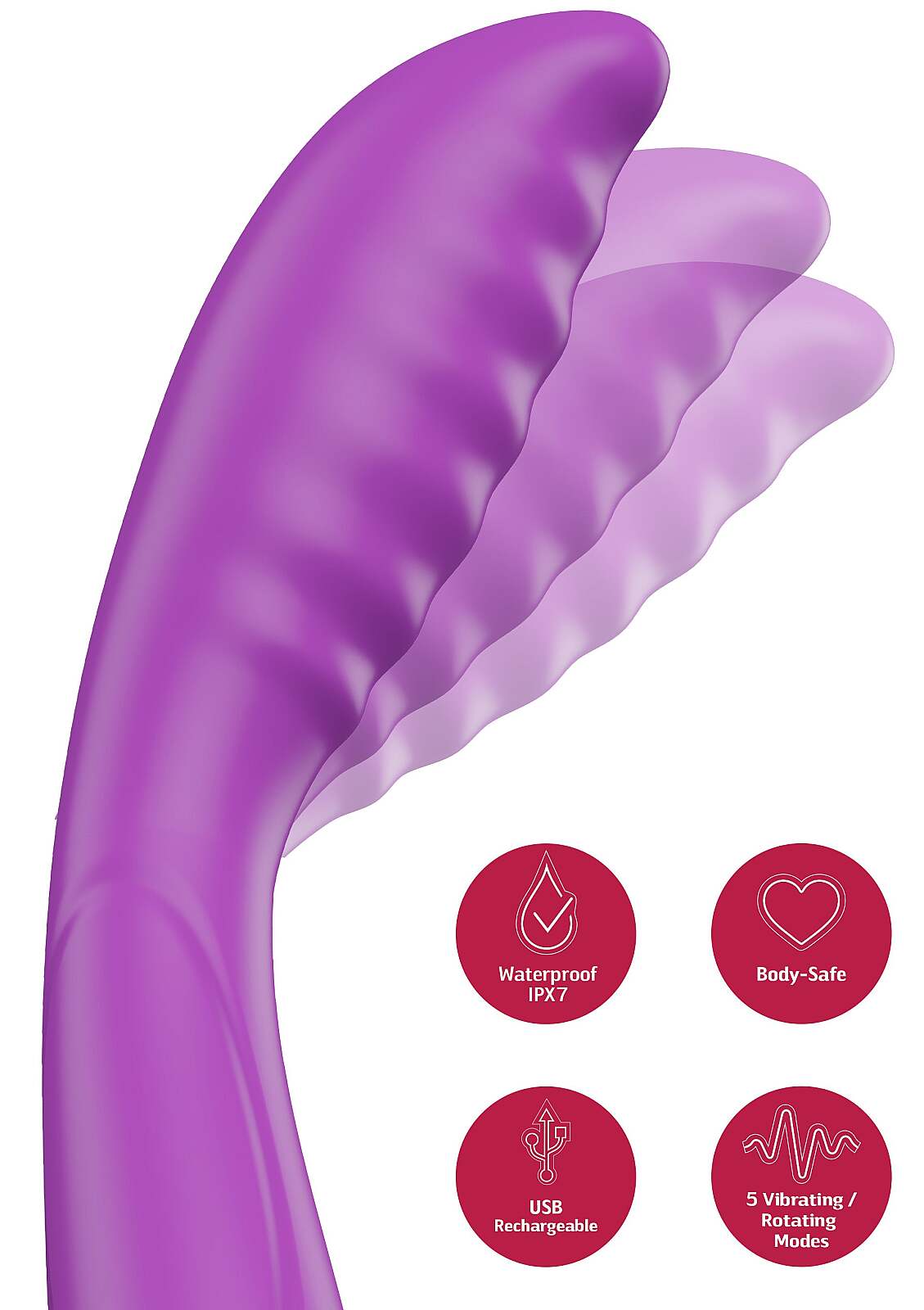 She.E.O Tapping G-Spot Vibrator thrills with a ribbed head that moves in a wide‑angle tapping motion, mimicking a teasing fingering to target the G‑spot with precision. The vibrating shaft adds deep, rumbly intensity that massages every curve. Enjoy 10 vibration modes and 10 tapping modes to tailor your rhythm from gentle flutters to bold pulses. The body‑safe silicone feels silky and the ribbing heightens delicious friction. A rechargeable Li‑Ion motor gives up to 60 minutes of play and powers back in about 90 minutes. With IPX7 waterproofing, it’s shower‑ and bath‑ready and easy to clean. Its 16 cm insertable length (18 cm total) and 140 g weight keep handling comfortable and precise. Dressed in elegant purple, it’s a statement of refined pleasure.